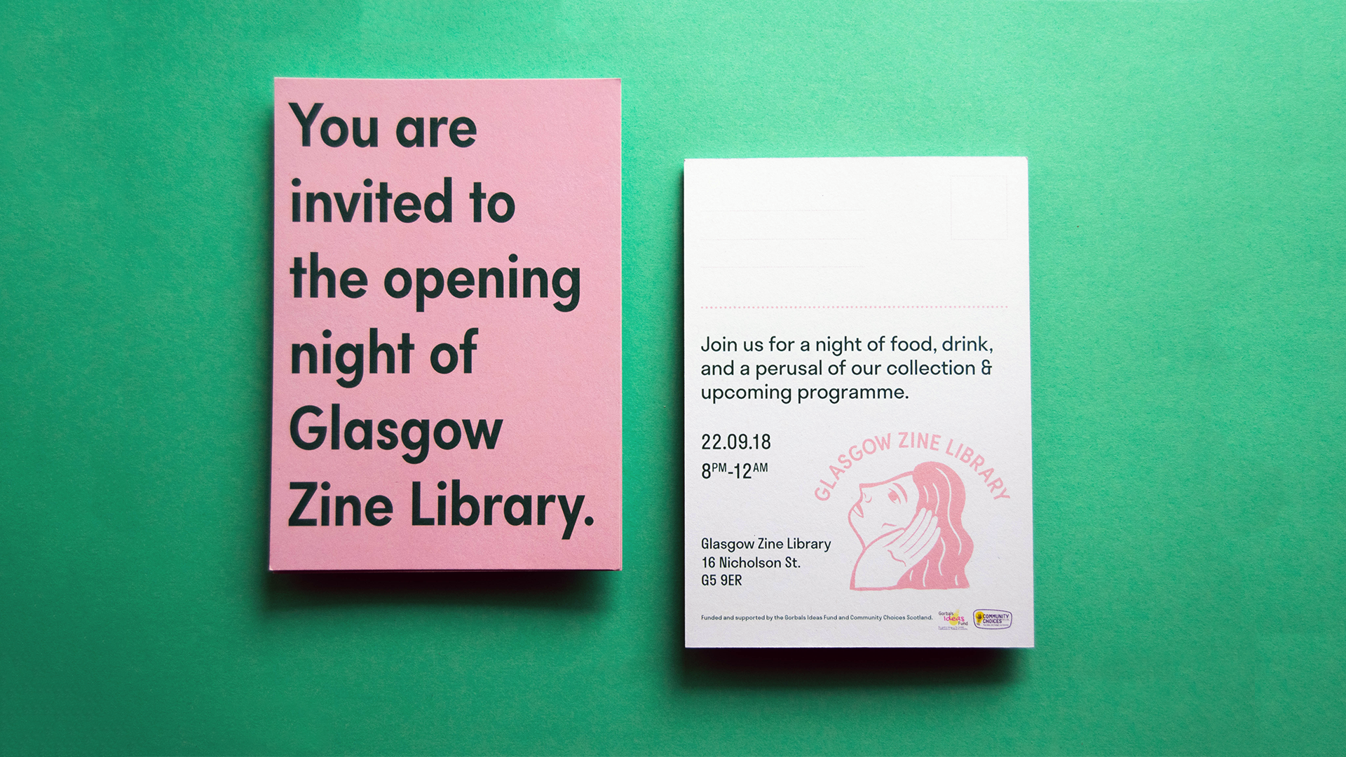 Postcard invitations for the opening night of Glasgow Zine Library.