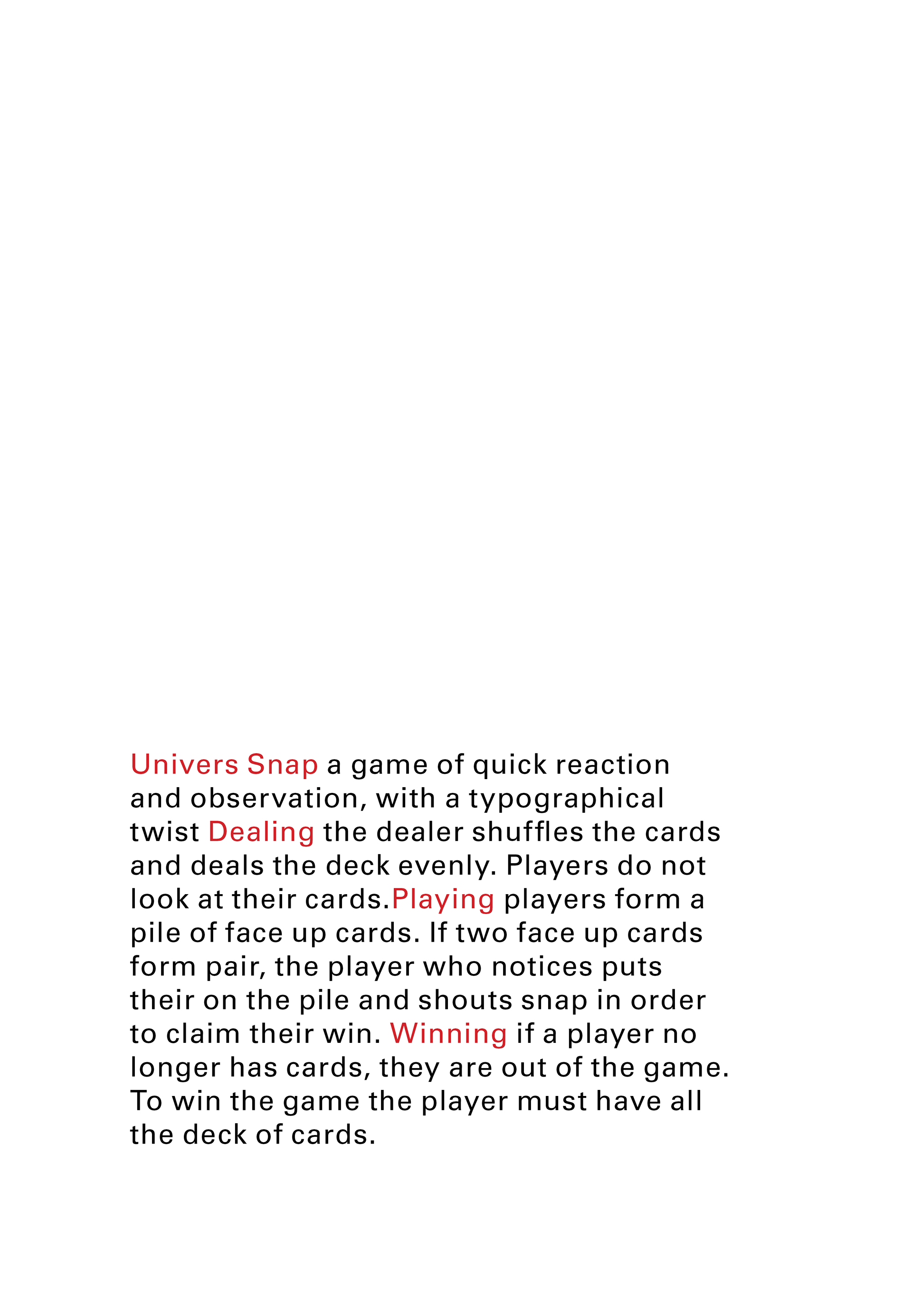 Learn typographic principles by playing the card game snap. Players must observe the subtle differences in the letter O form weights of the Univers Typeface.