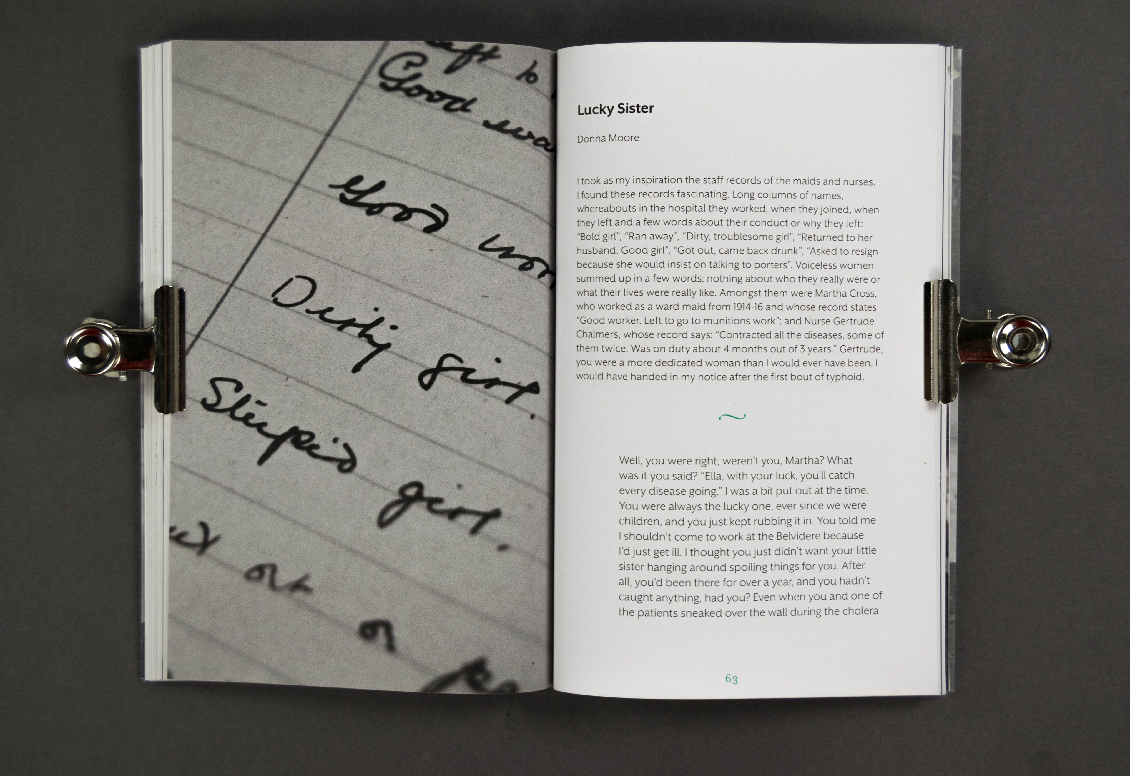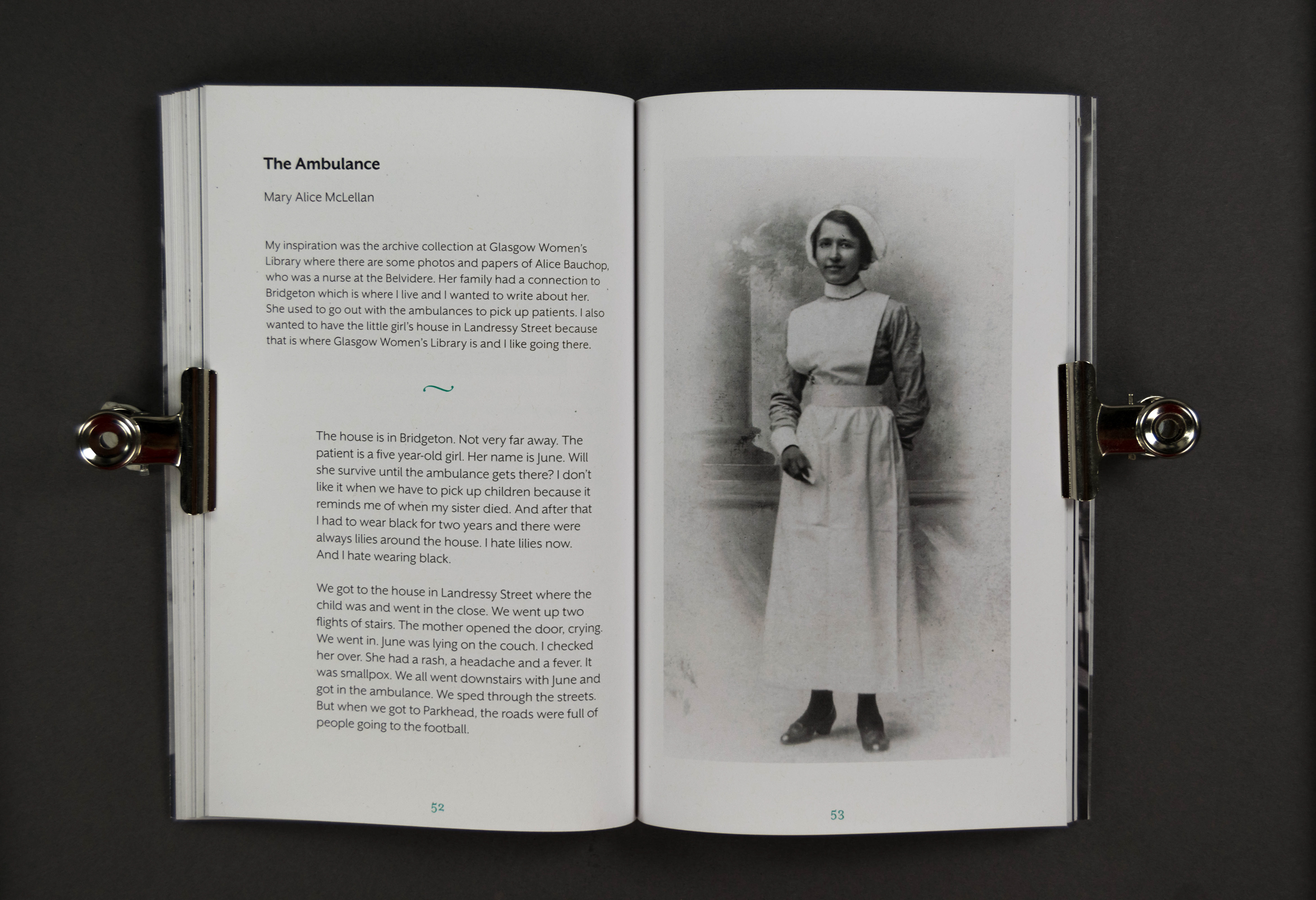 A book designed for the 'Voices From the Belvidere' creative writing project, were local women researched and wrote about the women associated with The Belvidere Fever Hospital in the East End of Glasgow around the time of World War One.